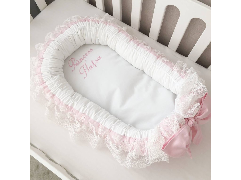 Naše prémiové hnízdo s krajkou a stuhou je ideálním místem pro vaše miminko, navržené pro maximální pohodlí a bezpečí. Díky promyšlenému tvaru a měkké výplni poskytuje útulný a chráněný prostor, který pomáhá dítěti cítit se klidně, jako by bylo v maminčině náručí.