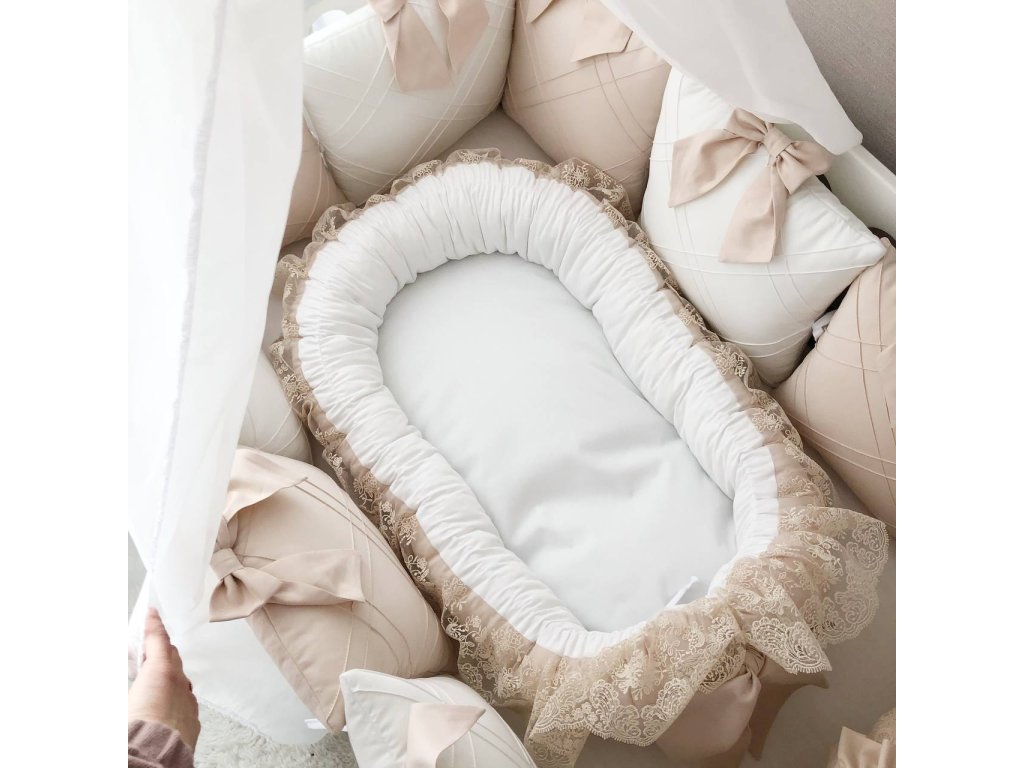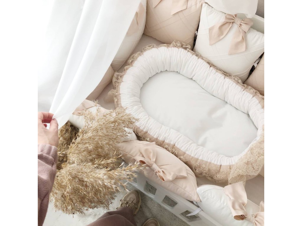 Naše prémiové hnízdo s krajkou a stuhou je ideálním místem pro vaše miminko, navržené pro maximální pohodlí a bezpečí. Díky promyšlenému tvaru a měkké výplni poskytuje útulný a chráněný prostor, který pomáhá dítěti cítit se klidně, jako by bylo v maminčině náručí.