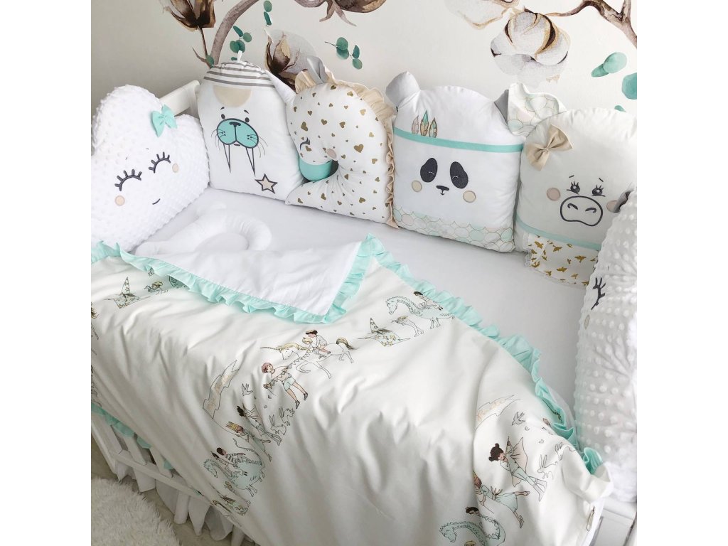 Konstrukce a design: Mantinel se skládají z polštaře (6 ks) o rozměrech 30x30 a 60x30 (postylka 120x60); 35x30 a 70x30 (postylka 140x70) ve tvaru zvířat, které se snadno upevňují po obvodu postýlky pomocí pohodlných šňůrek. To umožňuje pevné připevnění mantinelů a zabraňuje jejich posunutí. K dispozici je široká škála barev a vzorů, což umožňuje vybrat model vhodný do jakéhokoli interiéru dětského pokoje.