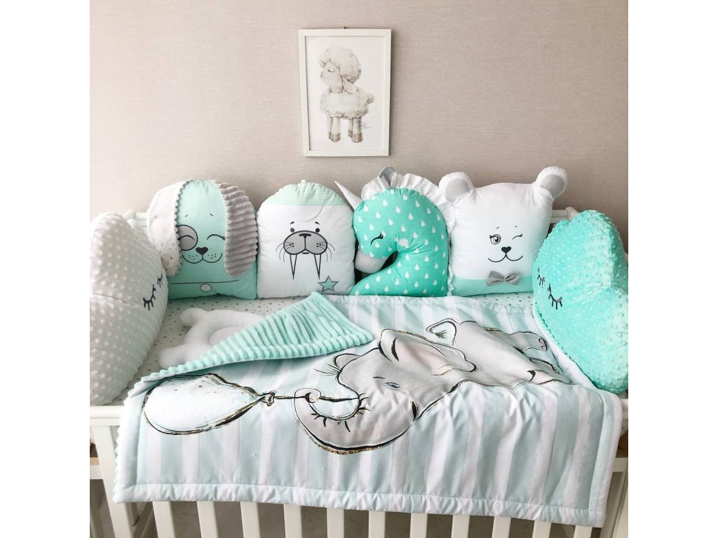 Konstrukce a design: Mantinel se skládají z polštaře (6 ks) o rozměrech 30x30 a 60x30 (postylka 120x60); 35x30 a 70x30 (postylka 140x70) ve tvaru zvířat, které se snadno upevňují po obvodu postýlky pomocí pohodlných šňůrek. To umožňuje pevné připevnění mantinelů a zabraňuje jejich posunutí. K dispozici je široká škála barev a vzorů, což umožňuje vybrat model vhodný do jakéhokoli interiéru dětského pokoje.