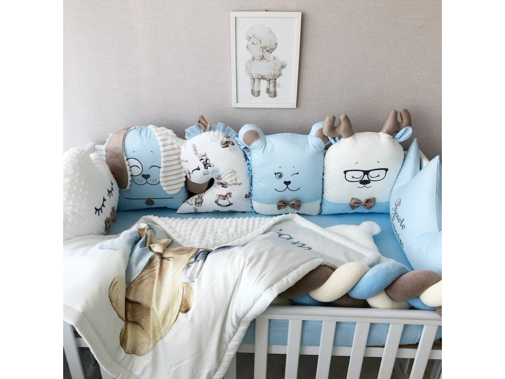 Konstrukce a design: Mantinel se skládají z polštaře (6 ks) o rozměrech 30x30 a 60x30 (postylka 120x60); 35x30 a 70x30 (postylka 140x70) ve tvaru zvířat, plus copánek na přední část postýlky, které se snadno upevňují po obvodu postýlky pomocí pohodlných šňůrek. To umožňuje pevné připevnění mantinelů a zabraňuje jejich posunutí. K dispozici je široká škála barev a vzorů, což umožňuje vybrat model vhodný do jakéhokoli interiéru dětského pokoje.