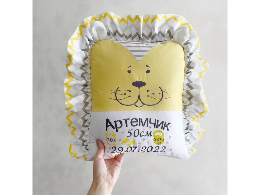 Na polštáři bude vyšito individuální informace o vašem dítěti: jméno, datum a čas narození, váha a výška.