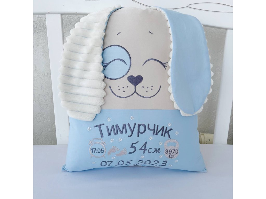 Na polštáři bude vyšito individuální informace o vašem dítěti: jméno, datum a čas narození, váha a výška.