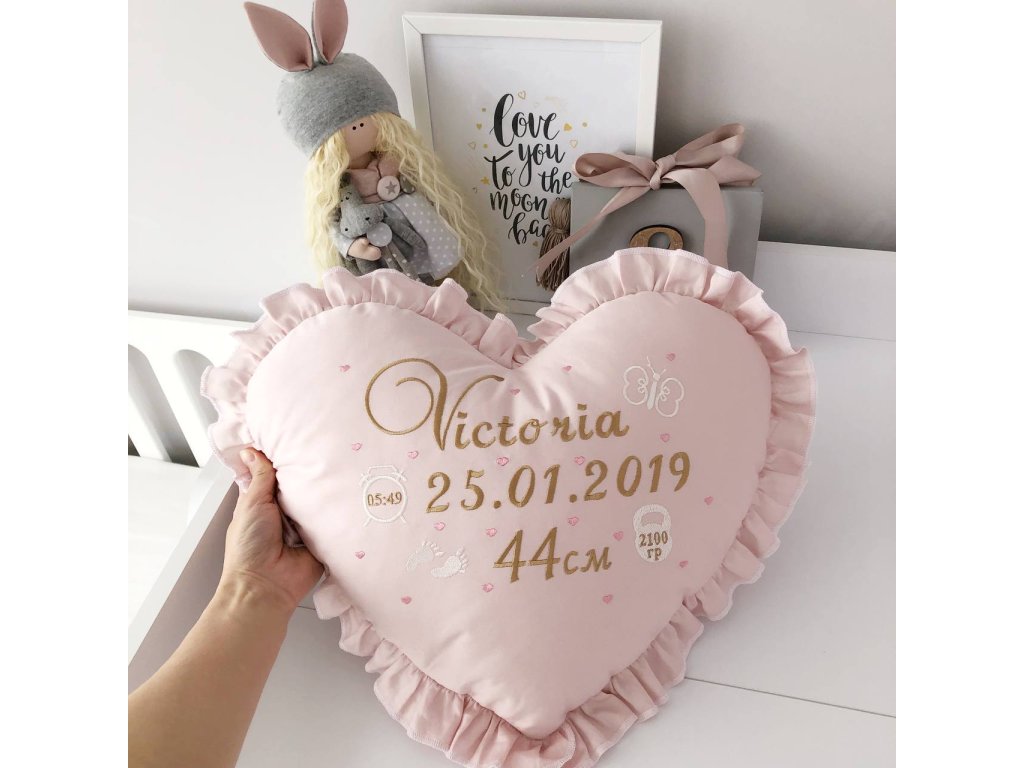 Na polštáři bude vyšito individuální informace o vašem dítěti: jméno, datum a čas narození, váha a výška.