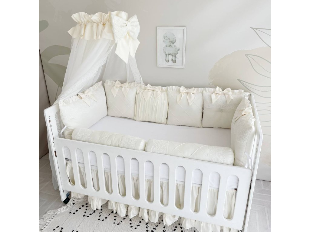 Design sady je promyšlen do nejmenších detailů: od barevné palety, která ladí s jakýmkoli interiérem, po elegantní detaily, které postýlce dodávají nádech elegance. Zvláštní pozornost byla věnována bezpečnosti: mantinely spolehlivě chrání dítě před průvanem a zároveň zabraňují nárazům o stěny postýlky.